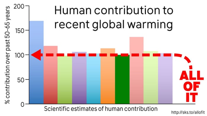 Human contribution to global surface warming over the past 50 to 65 years based on ten peer-reviewed studies (see sks.to/allofit for details). Illustration: Dana Nuccitelli and John Cook