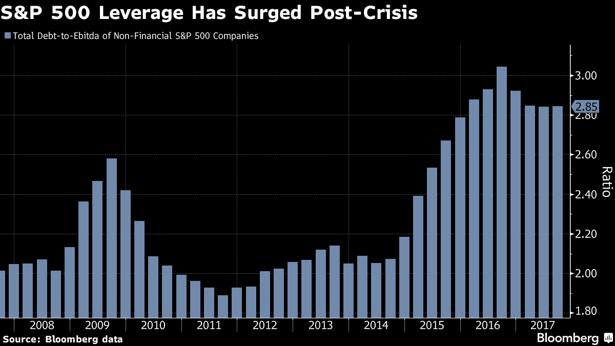 And overlooking it all is the pervasive niggle that comes with a growing debt pile. For all the indications of strain within, that shouldn’t be overlooked, according to Columbia Threadneedle’s Tannuzzo. Companies have sold $968 billion of investment-grade notes this year. Leverage ratios, a measure of debt to earnings, are near their highest since before the crisis for non-financial firms in the S&P 500.