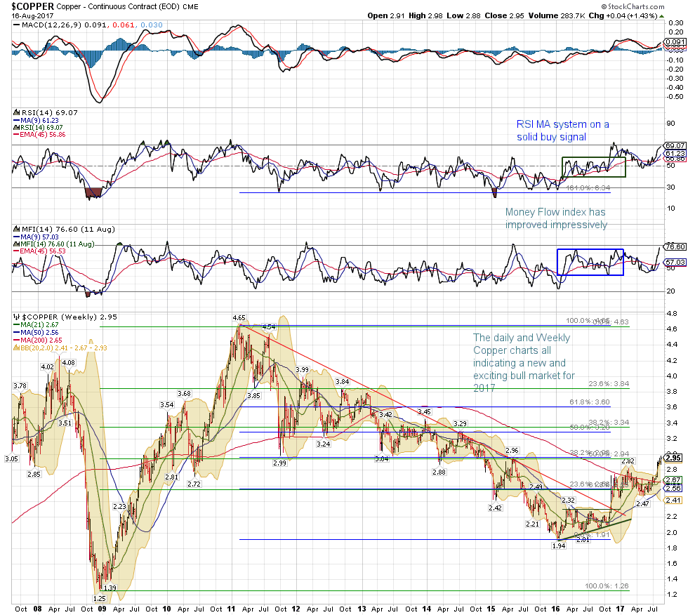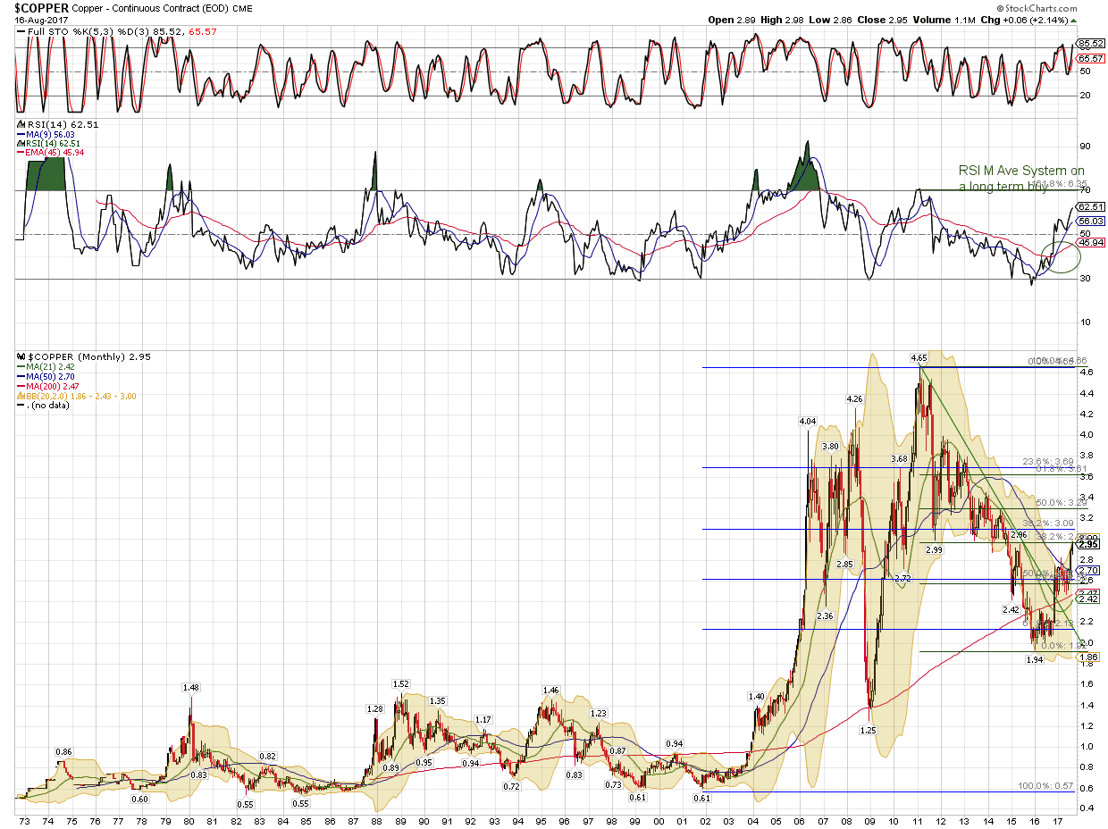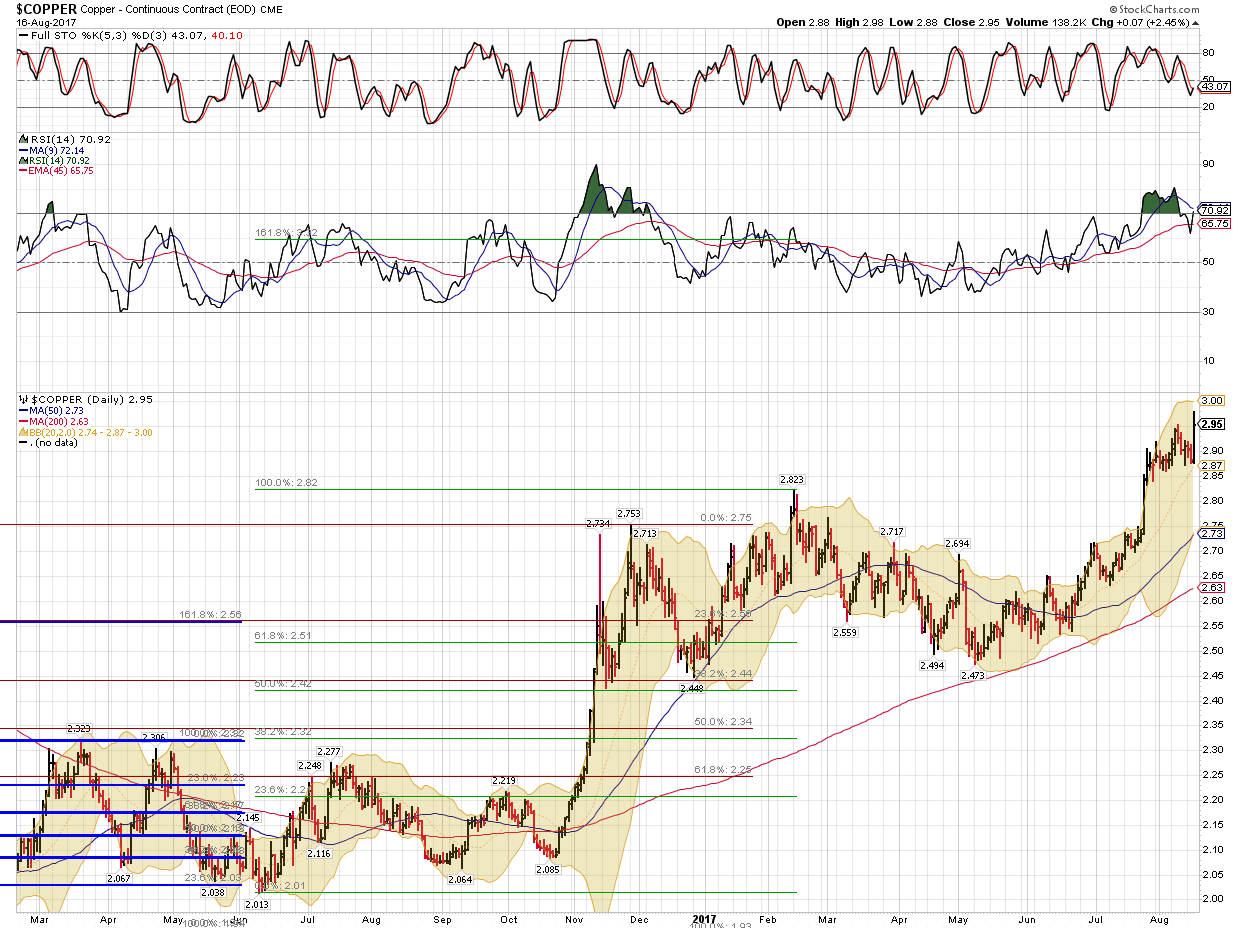 Respond to of 33421 Gold Is Shaken by a Mysterious 2 Million-Ounce Trade By Susanne Barton and Luzi-Ann Javier August 25, 2017, 1:22 PM EDT August 25, 2017, 3:11 PM EDT So much for a quiet Friday in late August.After weeks of relative slumber, gold traders were rudely awoken to a surge in volume and volatility. In a span of one minute, gold futures contracts equaling more than 2 million ounces traded -- about 20 minutes before Federal Reserve Chair Janet Yellen was to address a gathering of policy makers in Jackson Hole, Wyoming. The episode jolted the market after a measure of 60-day volatility on the metal touched the lowest since 2005. Gold had been in quiet mode even amid political discord in Washington, concerns about rising U.S. interest rates and tensions between the U.S. and North Korea. Yellen’s speech, which lacked clear rate cues, did little to calm the price swings and damped expectations of a rate hike this year. The market is “bipolar,” Bob Haberkorn, a senior market strategist at RJO Futures, said by phone. “Between now and the end of the year, the story is going to be the Fed. The Fed was pretty hawkish coming into the year. Now it feels like they are backing away from September.” Gold futures for December delivery rose 0.5 percent to settle at $1,297.90 an ounce at 1:36 p.m. on the Comex in New York, after falling as much as 0.8 percent and climbing 0.7 percent to briefly pierce the $1,300 threshold.After peaking at 21,256 gold futures contracts at 9:41 a.m., trading fell to 6,683 contracts a minute later . On June 26, the market was also rattled when 18,149 lots equaling about 1.8 million ounces of gold traded in just one minute . It later fell back to 2,334 lots. Federal Reserve Bank of Dallas President Robert Kaplan may have helped fuel the sharp move before Yellen’s speech Friday by saying the central bank can afford to be patient on raising interest rates even while noting it should shrink the balance sheet soon. ‘Difficult to Trade’“Kaplan was dovish and sent it higher,” Robin Bhar, an analyst at Societe Generale AG, said by phone. “I don’t know if anyone then got wind of what Yellen was going to say, but it then dropped like a stone. And then, when she didn’t mention monetary policy, things started to stabilize again.”“These are crazy markets, and very difficult to trade,” Bhar said of Friday’s gold moves. “The net result was extreme volatility.” Base metals also fluctuated Friday. Copper on the Comex settled unchanged at $3.0565 a pound at 1:27 p.m. in New York, after falling as much as 0.5 percent and rising 0.7 percent. The metal posted a seventh weekly climb, the longest stretch of such gains since 2009. “If you look at the chart, it just exploded to the upside,” Peter Thomas, senior vice president at Zaner Group LLC, said of the copper trading Friday. A few minutes later, “we came right back down. It was insane.” On the London Metal Exchange, copper slipped 0.3 percent after advancing as much as 0.9 percent. The five other main metals also fell.http://www.bloomberg.com/news/articles/2017-08-25/gold-shaken-out-of-slumber-by-a-mysterious-2-million-ounce-trade --------------------------- (editorial note by JJP: volatility is increasing across an array of markets and asset classes after a long period of slumbering....... with little volatility, this is the classic pattern of how The Capital Markets morph from a Bull Market in Equities into a Bearish time of upheaval and price erosion. Copper and the 10 year note which normally track each other nicely, have diverged wildly the past 6 months with Dr. Copper going up, up up and the yield going down. So either Copper is going to collapse in price and tell us we have an economic downturn OR Interest Rates are going to go North of 3% and then 4% and 5% and that will contract PE multiples and put the whammy on the massive borrowing being done by the corporate and sovereign sectors. -------------------------To: The Ox who wrote (19760 ) 8/16/2017 9:44:24 PM From: John P 2 Recommendations Read Replies (1) of 19797 DR COPPER at an important juncture... and daily USD looking like an upward correction since the low on 08/02/17 at 92.39.... I'll be showing the EUR and JPY later. Daily chart amazing how the 1.1618 fractal projection advance is in perfect alignment with the .618 fractal advance from an additional up wave,( both at $2.82 ) and notice how we are at 1.618 fractal price projection from the mid June to early July... 18 month daily chart with FIBS...... the 10 year Week Copper Chart with FIBS we are at a cluster of 2 different FIB time periods. Money flow is looking strong...... lt easy to believe there could be technical selling here.... but the thing about bull markets is that you don't pick tops.... as this is not a bull market top in my mind. Let's see how the price reacts ... and it's gonna be party time central for the bulls if we break through all these resistance levels we are at...... The 40 year monthly chart is amazing. The 40 year Monthly Copper chart with Fibs shows the real primary one retracement zone is $3.09 although we are at a weaker resistance here at 2.95......but we've traded up to $2.9811 tonight..... It's amazing all these different Fibs levels ..... I'm moving to reduce the long side a little but right now we could well see us break $3.000 on a trek higher.... We shall let price action be the AX ... as it always is.. The daily USD index has the distinct look of an upward corrective price advance since 08-02-17 low at 92.39 The USD index has been getting resistance at some Fib resistance points. JP