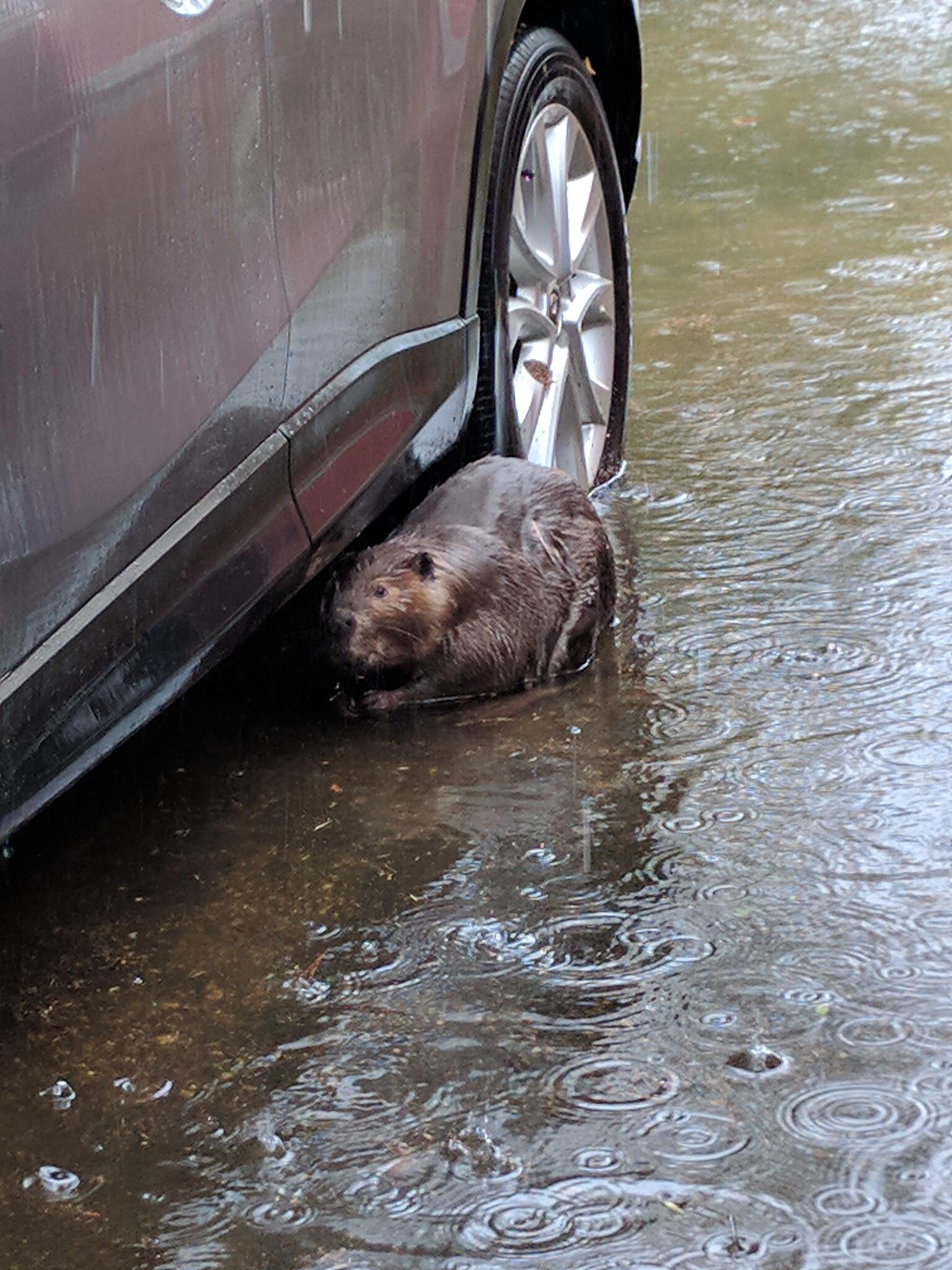 Beaver seeking shelter in driveway - not in our driveway but a block behind us. Think the boats on the creek scared him. And I'm sure wherever his home is its flooded.