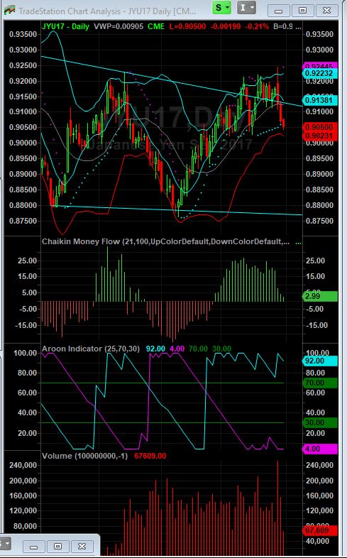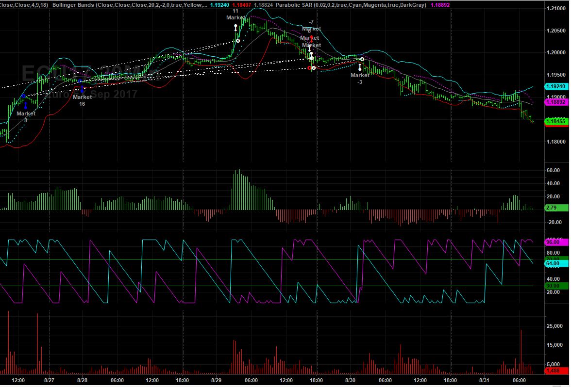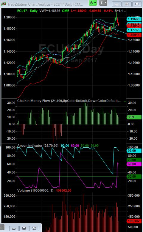 Message 31239578 The USD index like Magic caught support at the Fib 1.618 price projection fractal and an even more important Fib point as well as a Fib Arc all clustered at today's low...... I am out of my long Eur for now . .. Been long since 1.14 .. and doing some probing initial shorting of the yen here are the week in the EUR where i came in very long and managed to sell the top and then went short the EUR on the CME futures. my opinion significantly changed due to the technicals and what has been going on fundamentally the blue numbers on the right are buys the 11 near the top was squaring of the long and then I had a sell of 7 and a little later a sell of 3 more contracts making me short the EUR.... you can see our buying on on 8/26 and just after midnight on the 28th and then the big sell around 3 PM on 8/29 which got us square and then the shorting on the late afternoon of the 28th, with a little more selling in the wee small hours of the 29th. copper has continued to work........ This week has been the best week of our year... especially after coming after a strong week last week. the Yen 60 minute chart shows I went short 9 sept contracts in the afternoon of the 29th of Sept, your comment regarding the outside reversal day on the Yen chart plus my general bearishness on the EUR as of tuesday and the nice bottoming potential in the US buck had me really flip my currency profile significantly and I have to thank you as it was your negative comments on the JPY that helped to make me take a closer look and I liked what you were seeing as I was seeing it too. SO Thank you very much for this nicely trending short Yen trade......... Please be sure to bring all of your lay ups to me. ---vgb--- it makes my life all so much easier. ;-) Both of the currencies had very pronounced reversals and it' s tied into some of Draghi's thinking..... what is going on with Brexit the fact that the Germans can not make money exporting at 1.20 and the knock on impact from Hurricane Harvey all created a nice reversal day top.. The Yen on the daily chat had the outside reversal and significant deterioration in the daily Chaikin Money Flow so we are thinking alike............... I believe that we are currently thinking the same direction on all of the markets..... except for the stock market the dow futures the Chaikin money flow is negative and bearish for the last 5 sessions, the aroon has given a sell signal on a daily basis When I run daily charts of the SPX, the DJIA, the NDX, the COMPQ ...the volume on the rally the past days has been quite low.... that could be because of the labor day weekend..... but I have much less confidence the stock futures. indexes like the smh, ibb, look stronger.... VLO if it can take out $70 it will probably run to 85. Googl, AMZN, FB, have all started to rally after corrections and NFLX is looking particularly well as it held ' support at the 166 area and has now started to vault upward above it's 50 DMA. John