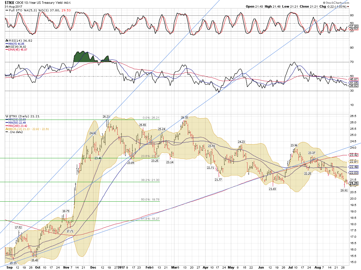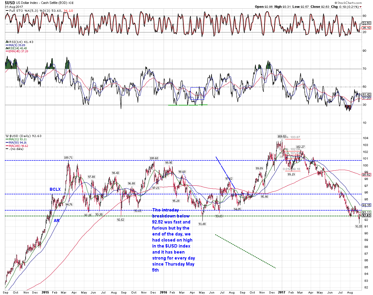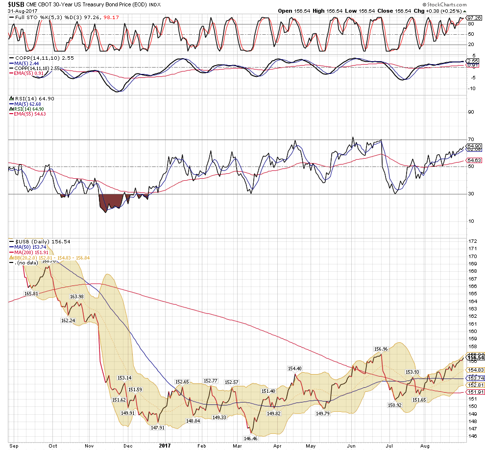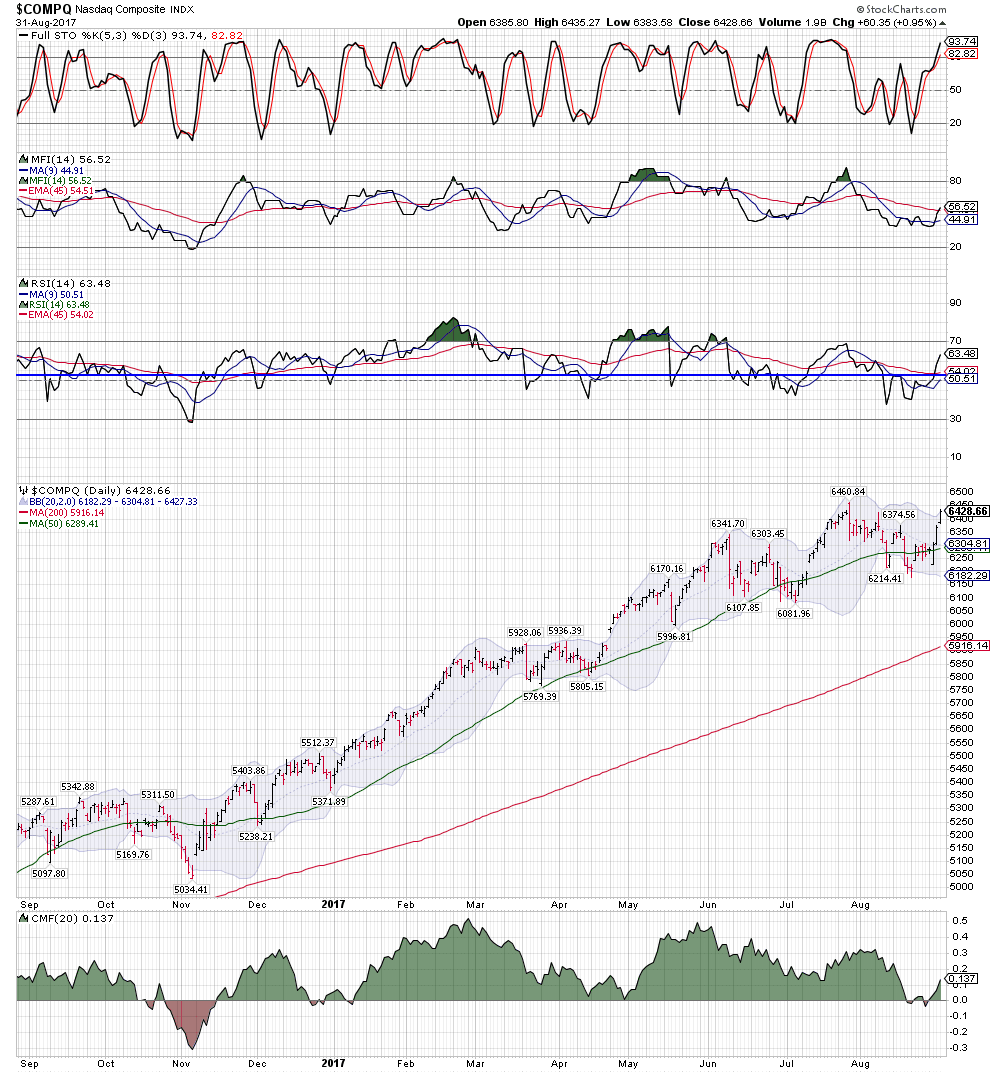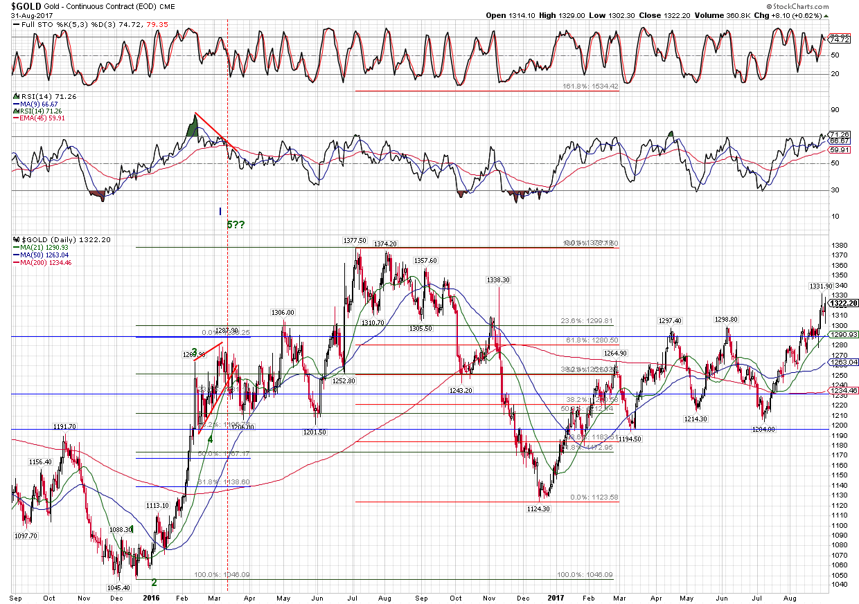 To: da_cheif™ who wrote (111703 ) 9/1/2017 5:52:56 AM From: John Pitera Read Replies (1) | Respond to of 208068 Good Morning Cheif, A few charts.. lets start off with the 20 year monthly NASD Compq chart which is done in equivolume bars..... 1st of all we decisively took out the 5132 high which was the High water mark for the NASD bubble back in March of 2000...that was taken out to the upside in the second half of 2016... quite bullish in the long term. 2) The month price bars have managed to get a bit outside and above the upper bollinger band, this is bullish as it shows upside momentum and markets typical go on to make a higher high when they are above the BB... if they are topping the will go no where near going above the higher BB. 3)We have had pretty stable volume on the advance the past 6 to 8 months. 4) The Month RSI Moving average cross over system is telling us 2 bullish things first the RSI has hit a higher high than the momentum high of 3 to 4 months ago... that is indicating accelerating momentum and at a minimum you would expect to see a higher high in price going forward, with a lower high on the RSI, THUS creating a potential momentum sell divergence.... that is presently not the case...... -- so this is bullish. 5) the RSI moving average crossover system is on a solid buy. --- bullish 6) the Full stochastic is suggesting the opportunity for a price pull back of some nature... but it is not predictive of the magnitude and has over all been a generating bullish looking market. Now remember this is a monthly chart and so you can get a 10/12% correction or even a 17% correction while keeping the larger bull scenario on track. The daily 1 year Nasd one the 1 year comp...the NASD has done a nice job of generally holding the 50 dma and has now been vaulting up northward... new highs distinctly possible we have had a nice move up in the full stochastic and it shows no sign of rolling over as of yet....more upside.. Again the springy price actions the last 3 days is nicely bullish. The Money flow index is improving and the Chaikin after giving us little scare by tinkering with going negative is back in positive territory and is improving at the moment.. Prices today slightly exceeded the upper bollinger band .... very bullish especially if we see a bigger break above the upper BB tomorrow or next week. A 3 year chart of the USD, for all of the fear and consternation regarding an excessively weak USD.... you can see that we are at the bottom of the range of the 3 year Wykoff box and This protracted sell off has gotten people bearish on the buck more due to the length of time of the correction.. and yet we have held the line in sand that has provided a few bearish fake outs of the past 3 years.... a Plus to the cheaper dollar is that overseas corporate earnings will carry a bigger bang for the buck due to the increasing competitiveness of US products and services when the dollar get towards the relatively undervalued side of the pendulum. This is a 3 year EUR/USD WyKoff chart and I have made a number vertical lines when the Bollinger Band width and t demonstrated how the market will top and bottom when the BB % get large or small enough. I left all the vertical lines the same and was going to see if anyone could observe the difference in why some tops coincide exactly with price tops and some bottoms align perfectly with th BB% at low levels. Some times they don't .... why would that be. since I am in a generous mode I will share with you an extremely use technique. what your will find is that when you use the BB % study.... It will be spot on in the corrective waves of a bull or bear market but the primary trend of the market you can get your ultimate low reading on the BB% and because the primary trend has more momentum the ultimate low will come a little past the low on the BB% which is logic since the power of momentum is with the primary trend.....In all honesty I don't think I have ever seen anyone who has laid it out and explained it as simply and concisely as I believe I have. And as we all know there is no such thing as the 1 perfect indicator.... otherwise what would be the point of the markets and people trading and investors looking for good entry and exit points. Rather, we are looking for the balance of evidence, everything from Momentum and momentum divergences, time cycles, Fibonacci price projections, more standard technical patterns and the measured move objectives derived from those pattern.... such as the break out of a rectangular range should move the distance of the range and if the sideways consolidation has been longer then that increases the probability of a larger measured move. often time we are not exactly sure if we are in a bull or bear market.. and there is ambiguity. This is one of the nice clean ways of 1) helping you determine if you are in a bull or bear market. It is really useful for getting you in on pullbacks that are opposite of the primary trend of the market and it also put you on notice that you are going to most likely get overshoots in the direction of the primary trend. 2)Another really beneficial aspect of this technique is that when a market morphs from a bull to a bear, or a bear to a bull, you will start to see how the BB% which was hitting the corrective lows at exactly the right spot on the actual low cease to do that and it give you a head's up of a change in the primary trend. I have some further research on this but way to tired to get into this morning. just rounding out quickly here is a gold chart to ponder .... we have managed to make it above several cluster of fibonacci retracements and the RSI momentum is strong...... Silver has been sluggish and I am not happy about that....I much rather be in obvious situations such as copper, the EUR, the Yen , Gasoline, heating oil, and long the EUR/JPY cross rate..... those have been the market that have treated me well and they are not conflicted. The 10 year note... it has th