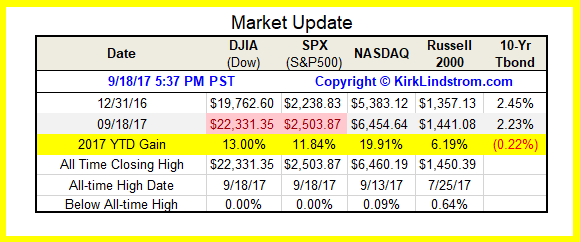 Today (9/18/17) the S&P500 and Dow Jones Industrial Average closed at new record highs.