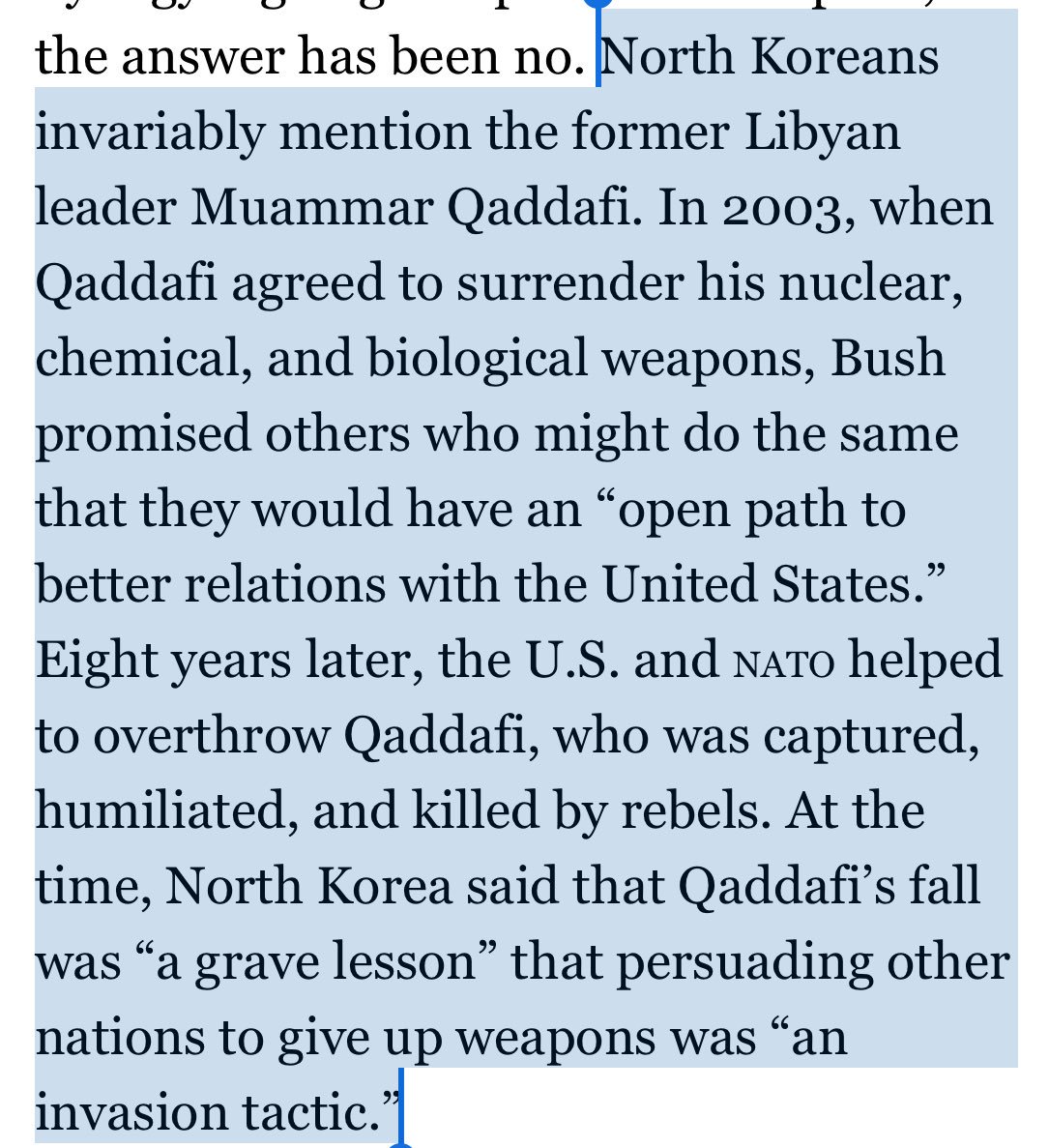 Bush had made Gaddafi no threat outside Libya, Obama taught the rogue nations of the world they had to go nuclear to survive.