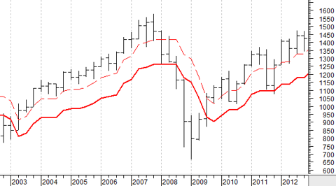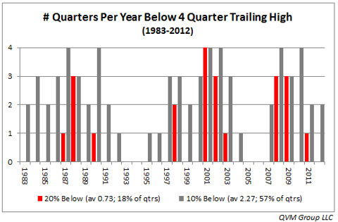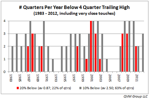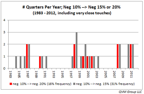 Respond to of 33421 How Often Does S&P 500 Have 10% And 20% Negative Price Moves? StopAlerts ,Mar. 19, 2013 dg>, of course, this is somewhat dated We looked into the question: How often does the S&P 500 experience a 10% correction or 20% bear price move? The data below answers that question.The takeaway is confirmation of what should be common knowledge for long-term investors, but common knowledge is often worth repeating - don't own stocks unless you understand and expect that a 10% decline from the 52-week high is likely multiple times per year, and that those declines need to be taken in stride - some other factors (e.g. fundamental, technical, macro, or investor needs specific) should come into play other than just a simple 10% price decline to exit stock positions, for those who are not traders. Stocks are highly variable in price and should not be owned without an understanding and tolerance of that fact. It is easy to believe that you are risk tolerant in up market periods, only to discover that you are not so risk tolerant in periods of market correction. Careful consideration of stock price volatility, and construction of an appropriately risk balanced portfolio is important. Looking at the price range by calendar quarter over 120 quarters (30 years) and determining if at any time during a quarter the price of the index was either at least 10% below the 4 quarter trailing high (a "correction" or worse), or at least 20% below the 4 quarter trailing high (a "bear market"), these data result: 57% of quarters have a price at least 10% below the 4 quarter trailing high (average 2.27 times per year)18% of quarters have a price at least 20% below the 4 quarter trailing high (average 0.73 times per year)The distribution of those events in time is shown in this bar chart. A more liberal look, allowing for price levels that are extremely close to negative 10% or negative 20% (essentially touching the thresholds), results in these data: 63% of quarters have a price at least 10% below the 4 quarter trailing high (average 2.50 times per year)22% of quarters have a price at least 20% below the 4 quarter trailing high (average 0.87 times per year)The distribution in time is shown in this chart. An obvious question is how often a 10% decline turns into something worse. Looking at the frequency of a 10% decline continuing to a 15% or greater decline, or a 20% or greater decline, these are the data from the past 30 years: 10% declines proceed to 15% or greater declines 31% of the time10% declines proceed to 20% or greater declines 16% of the time. The distribution in time is shown in this chart. Here are the actual quarterly price charts from 1983 through 2012 that plot the 10% and 20% levels below the 4 quarter trailing highs as a dashed red line and a solid red line respectively: