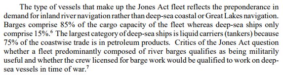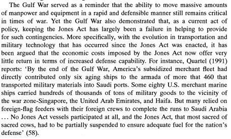 Though passed for national security purposes, theJones Act is worthless for that nowadays: