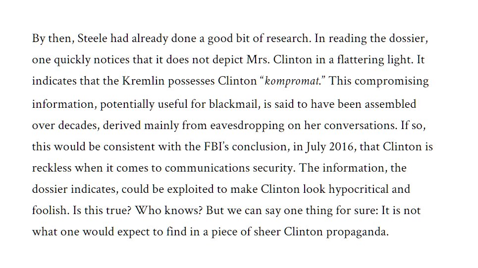 Ah, here is a blurb on Steele's finding that Russia had blackmailable kompromat on Hillary assembled over decades: