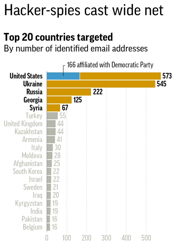 In Ukraine, which is fighting a grinding war against Russia-backed separatists, Fancy Bear attempted to break into at least 545 accounts, including those of President Petro Poroshenko and his son Alexei, half a dozen current and former ministers such as Interior Minister Arsen Avakov and as many as two dozen current and former lawmakers.