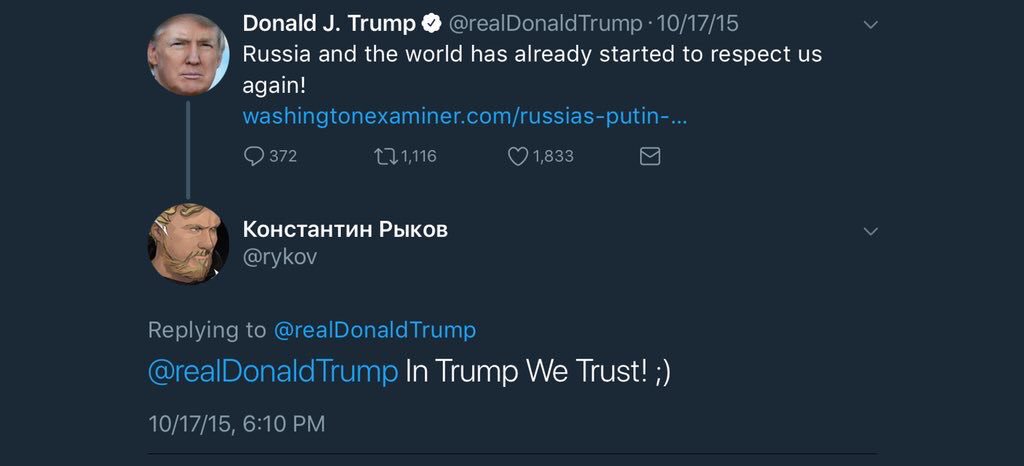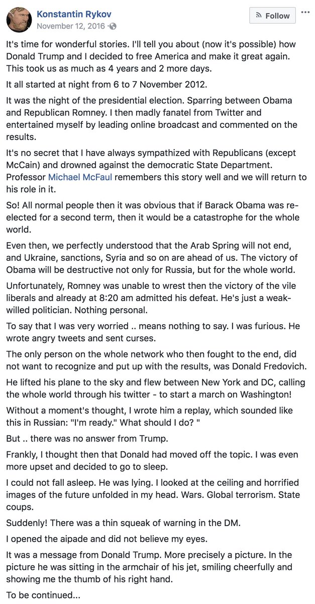 Read Replies (2) | Respond to of 46915 (THREAD) This is the most stunning revelation in the Trump/Russia investigation yet. My brother Brian @krassenstein predicted something like this was coming very soon, just days ago & here it is! Konstantin Rykov who is known as a Kremlin Propagandist with close ties to Putin (1) Ed Krassenstein ? @EdKrassen Nov 25 Replying to @EdKrassen @krassenstein ….published a message on Facebook just days after Trump won the election. It is a roadmap & confession saying that he and the Kremlin took part in a conspiracy to make Donald Trump the President of the United States.(2) It all began with the following Tweet that Trump made after @BarackObama won the 2012 election. (3) Rykov, responded to Trump, saying “I’m ready. What should I do?”. From that point forward, collusion (or I should say a Conspiracy Against the United States) commenced. Trump replied to Rykov with an image of him giving the thumbs up. (4) From there, the conspiracy arose, and Rykov actually admitted as much in a Facebook post he made on November 12, 2016 (see below) and another post he made on November 14, 2016 (see following tweet in this thread) (5)[ Note that Rykov called him Donald Fredovich, like I've started doing. ] FB Post from Nov 14, 2016 Rykov (6) Rykov obviously either didn’t realize that what he did would be viewed in the United States as an attack on our democracy, or he was completely telling a lie. The latter wouldn’t seem to make any sense though. Perhaps he was just feeling proud of himself and wanted to boast. (7) To me it’s obviously a legitimate confession, but one which Rykov didn’t think would actually come back and bite the Kremlin and Trump in the rear end. Boy was he wrong! (8) As we recall, Cambridge Analytica had sought to work with WikiLeaks in releasing emails form Hillary Clinton’s server. This FB post by Rykov suddenly has more meaning than ever before (9) If I were Robert Mueller, it becomes a huge piece to a puzzle that is being put together by his prosecution team, and more importantly it is a huge piece of evidence to show Trump conspired against the United States of America. (10) Thanks to my brother Brian @krassenstein and also WashingtonMonthly for helping put this together. From here on out, I fully expect things to snowball very quickly! (11) Here is Artem Klyushin congratulating Konstantin Rykov shortly after the election results were posted saying “once again amazed at the genius”. FYI: Artem Klyushin is a Russian billionaire and heavy critic of US/Russian sanctions. It's all coming together! (12) To this day Artem Klyushin ( @ARTEM_KLYUSHIN ) continues to attack the MSM as being FAKE NEWS and continues to support both @realDonaldTrump and Roy Moore. (13)Konstantin Rykov also runs Moscow's largest brothe l and celebrated in Moscow with Artem Klyushin the night Trump won the election. Kylushin met Trump in June of 2013, November of 2013, and he attended a Trump speech in Iowa in 2015. (14) Artem Klyushin made the following tweet around the same time his Rykov said it was time to "start helping Trump." (15) Additionally there are several allegations (which seem to be credible) that Kluyshin & Rykov were behind the 2013 Russian-prostitute scheme at the Ritz Moscow that aimed to get Kompromat on Trump . (16) Here is a photo of Yulya Alferova, Donald Trump, and Artem Klyushin at the 2015 Trump Speech in Iowa. (17) Artem Klyushin was also confirmed to be in a 2013 meeting with the Agalarovs and Trump, talking about #MissUniverse (among other things). (18) Yulya Alferova ( @AlferovaYulyaE ) is the wife of Artem Klyushin, and she posted in Junary of 2014 that Trump "would make a great President", showing she most likely knew of the plan at this point. (19) According to @SethAbramson , Rykov said in November 2016 that he and Klyushin have been trying to help Trump for years. The fact that Trump was working with them forms the basis of the criminal conspiracy. Simply put, DONALD TRUMP IS DONE! t.co (20) Ed Krassenstein added,Seth Abramson Verified account @SethAbramson 67/ If Kaveladze was working to lure Trump to Moscow in 2013, then shows up in 2016 helping the Kremlin aid Trump's candidacy, that's telling; if Rykov says in November 2016 he and Klyushin have been trying to help Trump for years, and Klyushin is at a 2015 rally, that's telling. Thanks to @imthemadridista for making me aware of this. Here is Yulya Alferova congratulating Trump after being elected and asking if the results were coincidence. (21) Remember Rob Goldstone? Here is Yulya Alferova and Rob Goldstone, Goldstone is Emin Agalarov’s publicist and helped broker the Donald Trump Jr Trump tower meeting. (22) Here is Trump with Emin Agalarov in June of 13’ with a comment from Yulya Alferova referencing a plan that Trump will succeed at. Emin then replies about a reveal in 24 hours. (23) Yulya Alferova replying to a Trump’s reference to Trump tower saying “I’m sure it’s just the start” (24) Here is a tweet of Rykov responding to Trump. (25) Here is Donald Trump shortly after the Moscow meeting saying the straightening out the Russia Syria situation “can be done!” Looks like that was part of the quid pro quo discussion. (26) Here is a tweet from 02/24/17 that shows Artem Klyushin talking about the Russian Trump flags he seemingly admits to commissioning. Translation in red. (27) Here is some more Rykov propaganda saying that, if elected, Trump would ensure that the US and Russia have a "very good relationship". He also links to his pro-Trump website which is still around today. (28) Here's a picture gifted to Rykov which apparently hangs in Rykov's office. It seems to be an open secret that he and Russia aided in getting Trump elected . (29) It's amazing how Trump supporters are in denial over these newfound pieces to the puzzle. Now they claim Rykov must of lied about his ties to Trump to try and make it look like Trump colluded. I've concluded that D