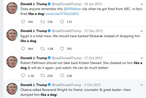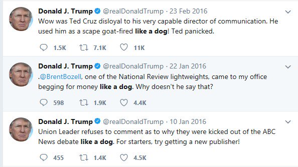 "like a dog" One of Trumpty's favorite phrases. He doesn't like dogs or any animals and they don't like him.