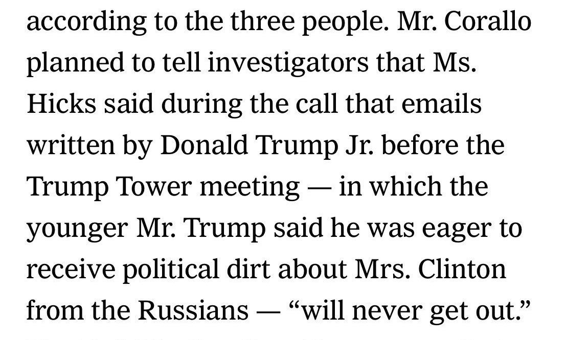 Oh man. Mark Corallo plans to tell Mueller that Hope Hicks said during a conference call with Trump that Don Jr.’s emails about the Trump Tower meeting would “never get out.” t.co