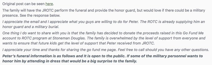 To: Brumar89 who wrote (1055486 ) 2/18/2018 6:20:48 PM From: Brumar89 Read Replies (1) | Respond to of 1577951 Military Members Rally To Honor Peter Wang, JROTC Hero Killed During Florida School Shooting Posted at 8:36 pm on February 17, 2018 by Sarah Rumpf Peter Wang, a JROTC cadet at Marjory Stoneman Douglas High School in Parkland, Florida. He died helping save his fellow students during the February 14, 2018 shooting at his school. Photo via Jesse Pan/Facebook. Peter Wang is a hero, and members of our military are rallying online to honor him and support his family.Wang, a 15-year-old freshman and cadet in the JROTC program at Marjory Stoneman Douglas High School , was killed during the shooting at his school last week. Multiple witnesses describe Wang wearing his gray JROTC shirt and helping hold open the door for his fellow classmates, allowing them to escape before him, when he was shot and killed. “He is so brave,” Wang’s cousin Lin Chen told the Sun Sentinel , noting that she was not surprised to hear of his heroism. “He is the person who is genuinely kind to everyone. He doesn’t care about popularity. He always liked to cheer people up. He is like the big brother everyone wished they had.” Members of r/military , the forum on the Reddit website dedicated to discussion of military issues, started brainstorming ideas to honor Wang yesterday . As a cadet in the JROTC, Wang was not yet an official member of the United States military, and so would not be entitled to the military funeral honors offered to service members and veterans, but his school’s JROTC have a protocol to conduct the funeral service and provide an honor guard. As one redditor, HighNoon44, commented , “Peter embodied the Army values and he was our brother.” In addition, the posters at r/military are organizing two main efforts . Those who are able to attend Wang’s funeral next week will attend in uniform. The service is open to the public and will be held at the Kraeer Funeral Home in Coral Springs on Tuesday, February 20, with visitation starting at 11:00 am ET and the service at 1:00 pm ET. Full details are available at here . Those who cannot attend are sending military patches and coins to Wang’s family. For privacy reasons, they are not posting the family’s address but have a web form where those interested can submit their email address to get mailing instructions. Wang’s family was so supportive of his participation in JROTC they have decided to donate any funds they receive from the GoFundMe fundraiser in his name to the Stoneman Douglas JROTC program. View image on Twitter Jared Keller ?@jaredbkeller JROTC freshman Peter Wang may not have actually served in the U.S. armed forces, but that's not stopping the members of r/military from arranging a uniformed presence at his funeral t.co 3:56 PM - Feb 17, 2018 The shooter who stole the lives of seventeen innocent people deserves no fame or recognition. Let’s do our best to forget his name and remember instead heroes like Peter Wang. May God bless his family and friends, and may the outpouring of support from across America provide some small comfort to them in their grief. If you are a member of the military or veteran and would like to participate in this effort to honor Wang’s legacy and support his family, please visit the r/military forum here .redstate.com