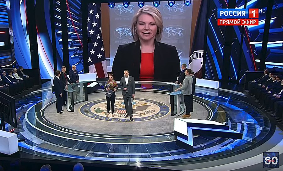 #Russia's state TV is on a desperate mission to portray the U.S. reaction to Putin's speech as "panic" or "hysteria." The hosts describe @statedeptspox, casually brushing off redundant questions from their channel's (VGTRK) reporters, as having a "strange, aggressive conniption."