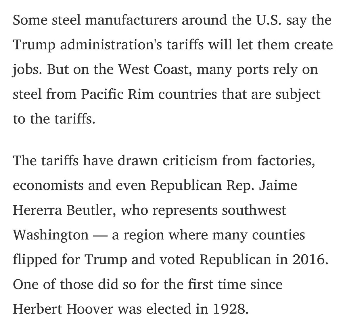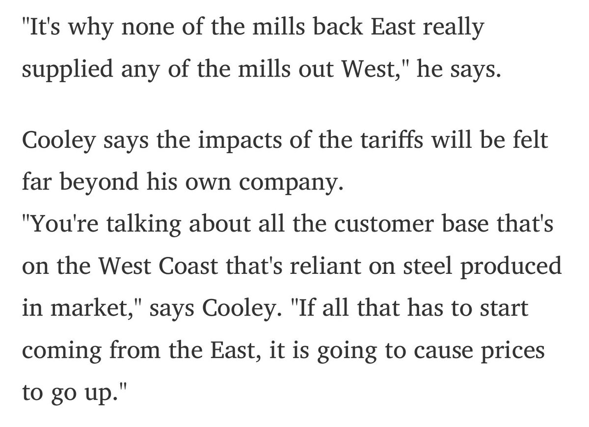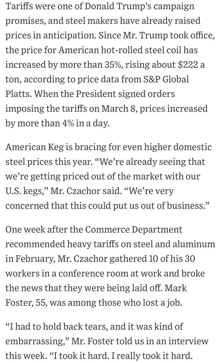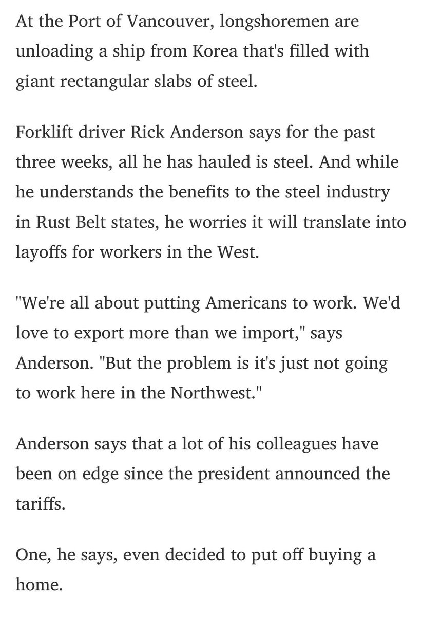 To: Brumar89 who wrote (1061070 ) 3/19/2018 2:22:47 PM From: Brumar89 Read Replies (1) | Respond to of 1574854 The cost of the trade war. It's not just foreign steel that will cost more, domestic producers will take advantage of the tariffs to raise their prices .. immediately. This is trashing investment plans. Builders who have a contract will see contracts turn into money-losers as their costs rise. The economics of drilling wells, of constructing pipelines, of building plants, of building cars just changed. That no one knows exactly when the tariffs will be imposed and what exemptions will exist, means no one can plan for them. This is another bad thing. Apparently some countries will have exemptions - some of those exemptions temporary. Exemptions will be traded over chocolate cake at Mar-A-Lago. This tariff regime and the crooked Trump and Kushner families are made for graft and self-dealing. Scott Lincicome ?Verified account @scottlincicome "Texas, Louisiana expected to lose trade war. Oil Industry prepares for worst" "Local companies concerned over President Trump's tariffs"JZ @jziol14 Replying to @eroccdotnet @scottlincicome The tariffs would be a minimum $100,000 annual hit to our small family machine shop . We decided to retire this year but feel the pain of our friends and acquaintances that are steel users who will have to deal with this egregious plan put forth by trump Scott Lincicome?Verified account @scottlincicome JimmyO @jimmyotx Replying to @scottlincicome Got a quote for structural steel the day after the tariffs were announced, just a residential remodel. Price were more than 2x what we were expecting. Trying to understand what effect these have had. But it’s more than a can each of Bud & Campbell’s. Scott Lincicome Retweeted Brian Thread (language warning at the end!)Brian @brian_yossarian Replying to @aallen82312 @scottlincicome @realDonaldTrump Our company installs rolling steel doors and (weirdly enough) trash chutes. We've received letters from suppliers and manufacturers that previously would lock in a quoted price for six months. Now, they can only do 30 days, with strict price increase caveats. Jay C ? @Mranthr0pe Replying to @JXMcQ @aallen82312 and 2 others I see them almost every, single day. Most very large companies will not accept any price increases mid-contract, no matter how legit the reason. They will threaten to pull the work, short pay the quoted price and fight you in court... literally anything they can do. Scott Lincicome Retweeted Andy AllenAndy Allen @aallen82312 Replying to @scottlincicome Already got a letter from Ferguson Enterprises about buying steel. We have to buy 4 months early because of this tariff and we bid the project a year ago. This is a real world disaster. Small construction companies will go out of business @realDonaldTrump Andy Allen ? @aallen82312 @realDonaldTrump Mr. President, my steel piping prices are going up 25% for a job I bid a year ago. We willl now lose money on this project because of these tariffs. Why are you doing this to small business people who voted for you? Scott Lincicome ?Verified account @scottlincicome "The Trump Tariff Layoffs Begin" #kegs #TNOIIECBAFTATPPAAFPDATW t.co [ Trump's business career shows he has no concern for small businesses, he routinely balked at paying contractors and trades people. Using the legal system to delay and force small suppliers to accept a percentage of what they were due. ] "On The West Coast, Ports Brace For Steel Tariffs" t.co