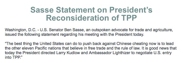 To: Brumar89 who wrote (1065100 ) 4/13/2018 1:19:51 PM From: Brumar89 Read Replies (1) | Respond to of 1578342 Bumbler in Chief puts America back in TPP after taking America out of it. Perhaps someone got it through his thick head that pulling out of TPP and starting a trade war with China was going to hurt American farmers in the red states that put him in office. When he made those bumbling moves he didn't care, but now he's threatened with impeachment. So he needs to mollify his base. President Trump Directs Administration To Rejoin Trans-Pacific Partnership Posted at 2:30 pm on April 12, 2018 by streiff One of President Trump’s first acts in office was withdrawing from the Trans-Pacific Partnership which was one of the signature accomplishments of the Obama administration, the others being giving Iran over a billion dollars in cash and a roadmap to a nuke and setting off a regional war in Syria and Iraq. With the stroke of a pen on his first full weekday in office, Mr. Trump signaled that he plans to follow through on promises to take a more aggressive stance against foreign competitors as part of his “America First” approach. In doing so, he demonstrated that he would not follow old rules, effectively discarding longstanding Republican orthodoxy that expanding global trade was good for the world and America — and that the United States should help write the rules of international commerce. Although the Trans-Pacific Partnership had not been approved by Congress, Mr. Trump’s decision to withdraw not only doomed former President Barack Obama’s signature trade achievement, but also carried broad geopolitical implications in a fast-growing region. The deal, which was to link a dozen nations from Canada and Chile to Australia and Japan in a complex web of trade rules, was sold as a way to permanently tie the United States to East Asia and create an economic bulwark against a rising China. Instead, Mr. Trump said American workers would be protected against competition from low-wage countries like Vietnam and Malaysia, also parties to the deal. But some in both parties worry that China will move to fill the economic vacuum as America looks inward, and will expand its sway over Asia and beyond. On March 8, eleven nations signed the trade deal :A group of 11 nations — including major United States allies like Japan, Canada and Australia — signed a broad trade deal on Thursday in Chile’s capital, Santiago, that challenges Mr. Trump’s view of trade as a zero-sum game filled with winners and losers. … Now, signatories are opening the door for China to join . Heraldo Muñoz, Chile’s foreign minister, told reporters on Thursday afternoon that Chinese officials had been weighing the possibility of signing on. “This will be open to anyone who accepts its components,” Mr. Muñoz said. “It’s not an agreement against anyone. It’s in favor of open trade.” … The new agreement — known as the Comprehensive and Progressive Agreement for Trans-Pacific Partnership — drops tariffs drastically and establishes sweeping new trade rules in markets that represent about a seventh of the world’s economy. It opens more markets to free trade in agricultural products and digital services around the region. While American beef faces 38.5 percent tariffs in Japan, for example, beef from Australia, New Zealand and Canada will not. That was then, this is now. Gabby Morrongiello ?@gabriellahope_ NEW: Senate Ag Committee Chair @SenPatRoberts says Trump told Rs at the WH today that he has asked Lighthizer & Kudlow to take a look at rejoining TPP 11:18 AM - Apr 12, 2018 Charlie Spiering ?@charliespiering JUST IN: @BenSasse tells reporters that during their meeting with Trump, he ordered Robert Lighthizer and Larry Kudlow to look at rejoining TPP - to open up more markets for farmers 11:26 AM - Apr 12, 2018 View image on Twitter Senator Ben Sasse ?@SenSasse It is good news that today the President directed Larry Kudlow and Ambassador Lighthizer to negotiate U.S. entry into TPP: t.co 11:47 AM - Apr 12, 2018 According to the Washington Post, the decision was reached by some conservative senators using mental kung fu on Trump : Sen. John Thune (R-S.D.) said that he and others at the table raised the point that “if you really want to get China’s attention, one way to do it is start doing business with all the people they’re doing business with in the region: their competitors.” Trump then told Lighthizer and Kudlow to “take a look at getting us back into that agreement, on our terms of course,” Thune said. “He was very I would say bullish about that.” Sen. Ben Sasse (R-Neb.) also confirmed Trump’s surprise move. “We should be leading TPP,” Sasse said. “China is a bunch of cheaters and the best way to push back on their cheating would be to be leading all these other rule of law nations in the Pacific that would rather be aligned with the U.S. than with China.” Engaging in talks to reenter the TPP would be part of a broader White House strategy to respond to an escalating trade flap between Trump and Beijing. Trump is looking for ways to crack down on what he believes are unfair trade practices in China, but he is having a hard time rallying other countries to backstop his push to impose new tariffs or raise the costs of exports and imports for China. I expect there are two forces at work here. Or maybe three. First, this opens markets to US exports, particularly agricultural exports, that are vulnerable in the trade spats Trump is picking. Second, the possibility of China being asked to join makes the US joining mandatory. And last, but not least, Trump’s people will be negotiating it, not Obama’s, so by definition, it won’t be a terrible deal. John Podhoretz ?@jpodhoretz after we join TPP, Trump will join Black Lives Matter 11:41 AM - Apr 12, 2018 redstate.com