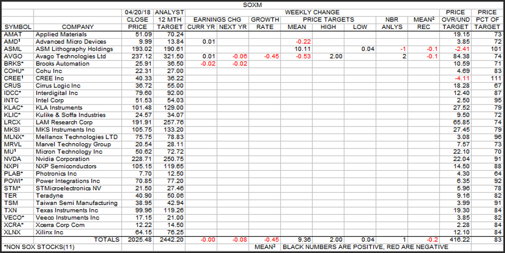 This is the weekly look at the change table for the SOXM stocks in terms of several parameters.