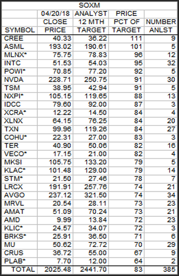 This is the weekly comparison of the consensus 12 month target prices for the SOXM stocks compared to Friday's closing prices.
