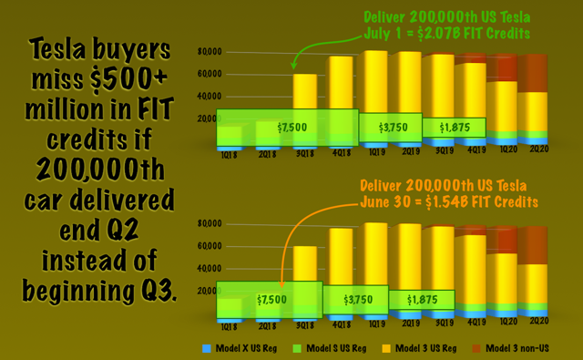 Read Replies (1) | Respond to of 1575426 Tesla can get another half billion from US taxpayers for their rich toy car buyers if they delay production of their 200,000th vehicle till after 6/30. Want to bet they will? This Simple Tesla Production Trick Could Cost Taxpayers An Additional Half Billion Dollars April 24, 2018, 10:41 am The Federal government provides a $7500 tax incentive for the buyers of electric cars. This is an attractive discount on a $100,000 Tesla Model S, but is a huge incentive for a $40,000-ish Tesla Model 3. However, there is a sunset for this incentive. It turns out it begins to phase out for a given company in the first quarter after that company sells its 200,000th eligible electric car (two quarters at $3750, two quarters at $1875, then zero). By the end of the second quarter, Tesla will be approaching its 200,000th car. The numbers will likely be close enough that Tesla could likely easily manage to move the date for this event either just before or just after the end of the quarter. The obvious incentive for Tesla, if it is going to be this close, is to build inventory at the end of the quarter, but keep actual deliveries under 200,000, then go full speed ahead with deliveries in the third quarter to maximize the last of the full tax credit. Randy Carlson has created a model that looks at the case of Tesla delivering its 200,000th car on June 30 vs, July 1 (ie 2nd quarter or just in the third quarter) and demonstrates that the additional tax incentives by pushing this even into July are as high as a half billion dollars! His model is below. http://www.coyoteblog.com/coyote_blog/2018/04/this-simple-tesla-production-trick-could-cost-taxpayers-an-additional-half-billion-dollars.html