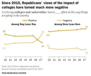 Starting with the brief rise of the Tea Party in 2010, that all changed, and the intellectual rot of the GOP has accelerated under President Trump. In a July 2017 Pew poll, just 36% of Republicans said colleges and universities have a positive impact on America, and a stunning 58% said they have a negative effect.
