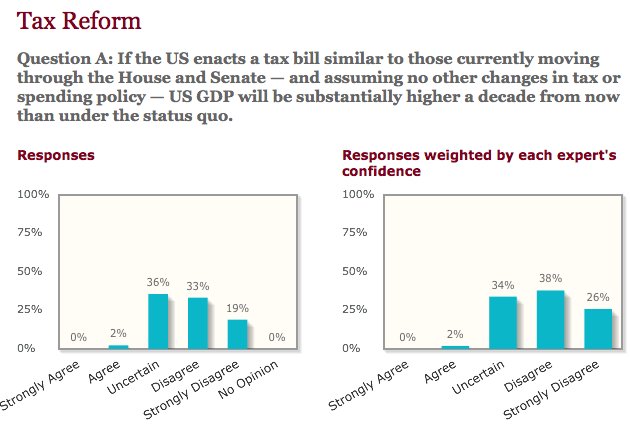 The Initiative on Global Markets’ panel of economic experts was recently asked about the Republican tax plan. Among the experts who took a position either way, there was a 96% consensus that the plan would not substantially grow the economy more than the status quo, and a 100% consensus that it would substantially increase the national debt.