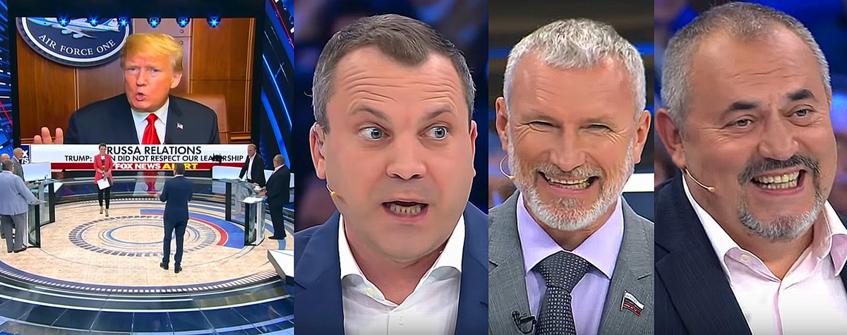 #Russia's state TV: Hosts and politicians react to Trump's suggestion that Putin would give up Crimea, get out of Ukraine and Syria if Trump asked him nicely. Everyone chuckles or laughs out loud.