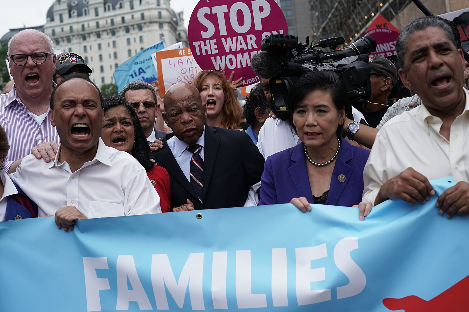 Democratic members of Congress protest the Trump family separate policy. From left to right: Reps. Joseph Crowley, Luis Gutierrez, Pramila Jayapal, John Lewis and Judy Chu.