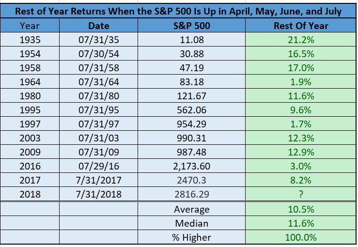The S&P 500 closed higher in April, May, June, and July this year. What happens next? Going clear back to the '30s, the final 5 months have been higher every single time (11 for 11), with some really strong returns.