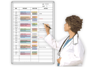 The board is hanging at the nurse's station in a psych hospital, and lists the patients, rooms, and docs.