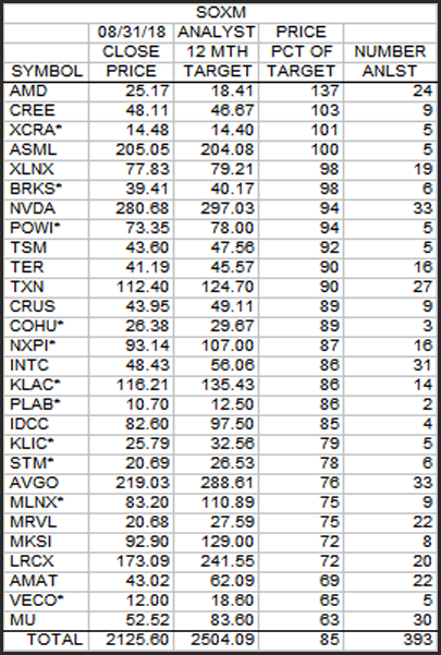 This is the weekly comparison of the consensus 12 month target prices for the SOXM stocks compared to Friday's closing prices sorted by percent difference.