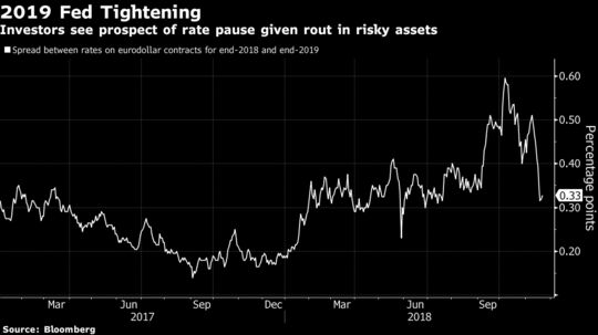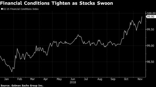Powell will get chance to spell out the Fed’s thinking when he addresses the Economic Club of New York on Nov. 28. Speaking in Dallas last week, he laid out a scenario for a pause in the central bank’s interest-rate hiking campaign sometime next year by highlighting potential headwinds to the U.S. economy. Powell’s decision to hold a press conference after every policy-making meeting starting next year gives the FOMC more flexibility to pause because it will have a realistic option of raising rates at its next gathering, said Nathan Sheets, chief economist at PGIM Fixed Income. More Press ConferencesThe Fed currently only holds a press conference every other meeting and investors have tended to discount non-press-conference meetings for policy action, even though officials have repeatedly said every meeting is live. Any scaling back in the Fed’s rate projections would face complications. President Donald Trump has vociferously and repeatedly criticized the Fed’s rate increases. “We have much more of a Fed problem than we do with anyone else,’’ he told reporters in Washington on Tuesday. The last thing that Powell and his colleagues probably want is to be seen as caving in to the president’s demands. That would undermine the central bank’s credibility and could cripple its ability to steer the economy. The Fed also likely wants to avoid being seen as rushing to the rescue of the beleaguered stock market. Powell said last week that equity price moves were only one of many factors that the Fed takes into account in setting policy. “Central banks by their nature don’t want to seem fickle,’’ Feroli said. “If their rhetoric changes abruptly, people will think they’re playing to the equity market.’’ Besides, the Fed has been seeking some tightening of financial conditions in the markets to help slow growth and prevent the economy from overheating. For much of its rate hiking campaign that hasn’t occurred. And even with the recent market turmoil, financial conditions are still supportive of growth, Hooper said. The risk is that the market moves could happen in a “very sharp and non-linear’’ way rather than being the “gradual thing that everybody always hopes for but never seems to happen,’’ Tobias Adrian, financial markets chief at the International Monetary Fund, told a Cato Institute conference in Washington on Nov. 15. Powell said last week that policy makers will be monitoring how financial markets, businesses and the economy respond to dearer credit as the FOMC weighs how far and how fast to raise rates. “The debate right now isn’t whether they go in December,’’ Bank of America’s Harris said. “It’s about when do they pause next year. That’s going to be increasingly data dependent and it’s going to be a game-day decision to some degree as we go into next year.’’