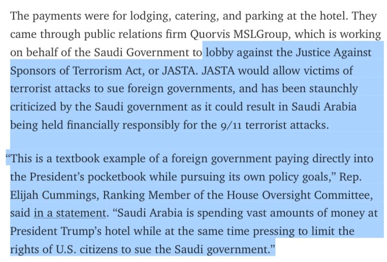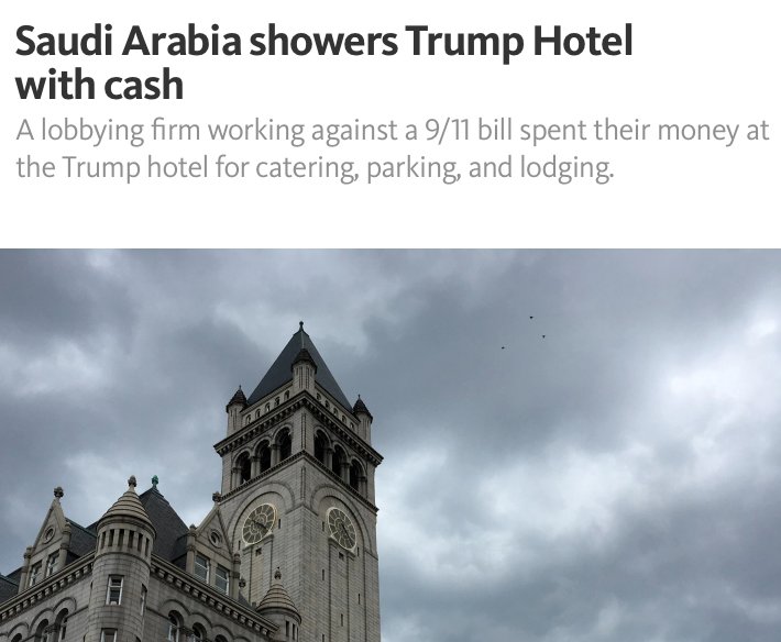 Between Nov 2016 & Feb 2017, Trump’s DC hotel received $270,000 from the Kingdom of Saudi Arabia. The payment came through a lobbying firm working against the 9/11 bill, which would allow victims of terrorist attacks to sue foreign governments. #Maddow