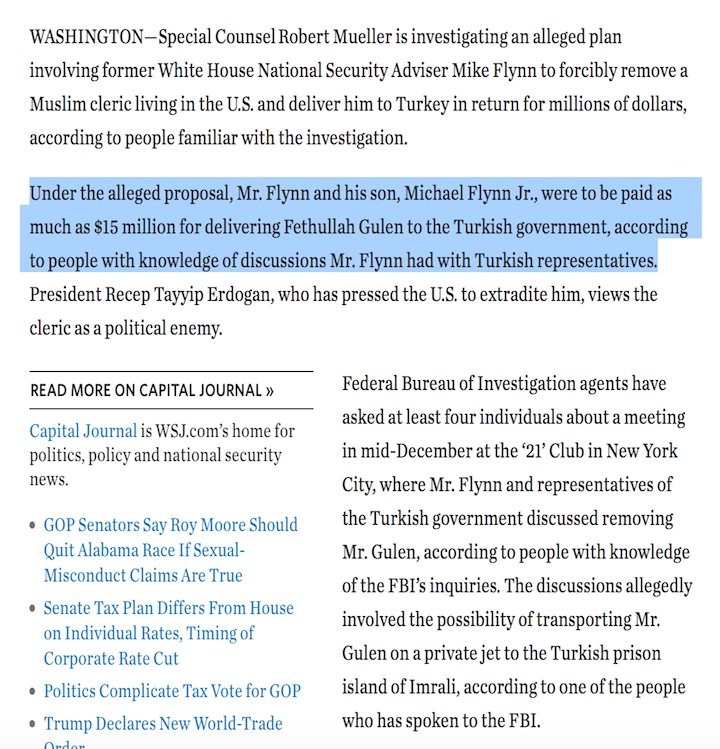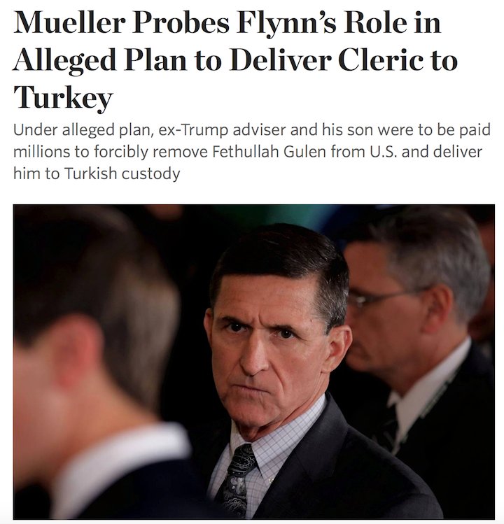 Mueller is investigating ex-Trump NSA Mike Flynn and his son’s role in a plot to kidnap Fethullah Gulen, a Muslim cleric living in the US, and deliver him to the Turkish govt in return for $15M.