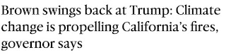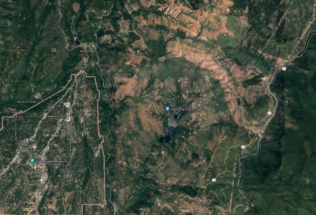 As long as I taking on taking on claims of global warming-fire connections, some folks like to talk about tree deaths, bark beetles, and the like, with the claim that global warming is killing trees and thus leading to fires. The Camp Fire areas is NOT noted for tree death and besides, most of the fire was on chaparral vegetation. Below is a satellite photo showing the boundaries of Paradise (brown line), with the fire starting near Pulga (on the NE side of the image). The fire spread over a region that had been logged, previously burned, and was then mainly grass and small shrubs.  In summary, if one analyzes the situation, it is evident that global warming had little to do with the Camp Fire. As I will discuss in a future blog, the Paradise area was a ticking time bomb. There was a huge influx of population into a wildland area, which had burned many times in the past. Previously logging and fires had left a conduit of highly flammable grass and bushes, through which fire could move rapidly. Flammable, non-native invasive grasses had spread through the region. Homes were not built to withstand fire and roadways were inadequate for evacuation. Powerlines started the fires and were not de-energized even though strong winds were skillfully forecast. Warnings to the population were inadequate. The list is long. And global warming should not be on the list if we are to focus on the real problems.  |