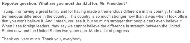 Pool asked Trump this morning what he is most thankful for. Even though he had just finished speaking with U.S. troops, he said that he is most thankful for...himself