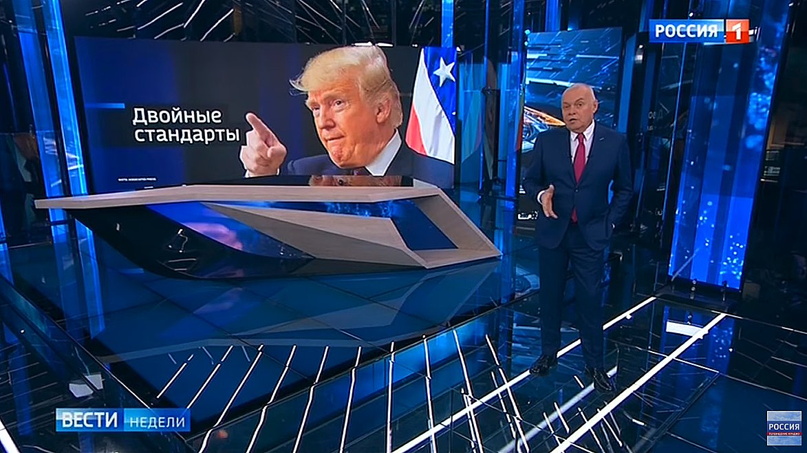 #Russia's state TV fails to condemn the #Khashoggi murder, referring to it as a "provocation against Prince Mohammed bin Salman." Host Dmitry Kiselyov enjoys the opportunity to mock the weak response by the U.S. & the UK, describing them as "snakes spinning on a skillet."
