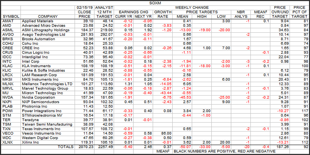 This is the weekly look at the change table for the SOXM stocks in terms of several parameters.