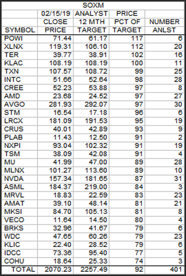 This is the weekly comparison of the consensus 12 month target prices for the SOXM stocks to Friday's closing prices sorted by percent difference.