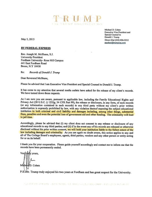 "Exhibit six" - letter threatening the president of Fordham University from releasing Trump's grades t.co pic.twitter.com/ZqqpmghPl9