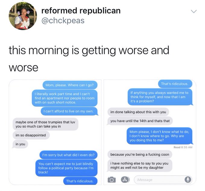 “thank [sic] you all so much for your overwhelming support. After seeing this tweet my parents cut me off and refuse to pay my university tuition. So if you can find it in your hearts to help, this young black Republican pay for school it would be appreciated.”