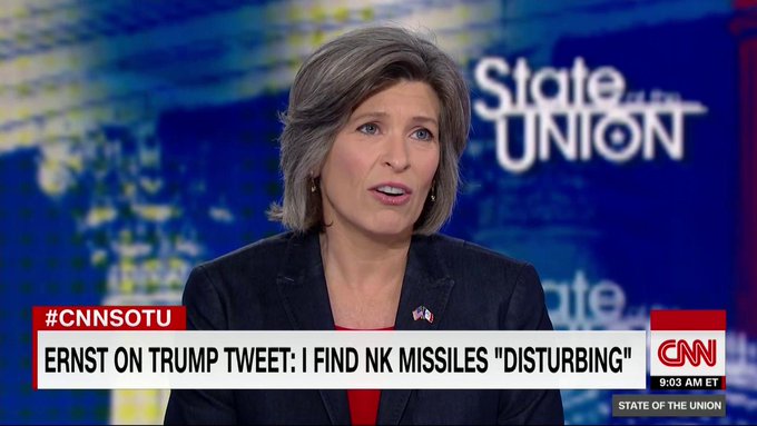 Respond to of 1575596 GOP Senator Splits With Trump On North Korea: 'Those Strikes Are Disturbing' Hayley Miller Sen. Joni Ernst (R-Iowa) on Sunday pushed back against President Donald Trump ’s nonchalant response to North Korea ’s recent missile strikes, calling for the U.S. to take a “strong stance” against the authoritarian regime. National security adviser John Bolton said Saturday that North Korea violated United Nations Security Council resolutions by conducting several short-range missile tests. But Trump, tweeting from Tokyo during his visit with Japanese Prime Minister Shinzo Abe, downplayed the missile tests and seized the opportunity to mock one of his 2020 Democratic presidential rivals, former Vice President Joe Biden. “North Korea fired off some small weapons, which disturbed some of my people, and others, but not me,” the president tweeted. “I have confidence that Chairman Kim will keep his promise to me, & also smiled when he called Swampman Joe Biden a low IQ individual, & worse. Perhaps that’s sending me a signal?” CNN’s Dana Bash on Sunday asked Ernst, a member of the Senate Armed Services Committee, whether she was disturbed by the airstrikes, which Bash noted were launched “right across the sea” from Japan. “I find them very disturbing and certainly wouldn’t trust Kim Jong Un,” Ernst said on CNN’s “State of the Union.” “I think we need to keep our eyes on North Korea. I understand the president wants to maintain a relationship with North Korea so that we can work with them. However, those strikes are disturbing.” State of the Union ?@CNNSotu "I understand the President wants to maintain a relationship with North Korea so that we can work with them. However, those strikes are disturbing." - Sen. Joni Ernst on President Trump downplaying North Korea's short range missile tests t.co #CNNSOTU 20 9:22 AM - May 26, 2019 Bash continued to press Ernst: “The fact that the president says they’re not, while in the region ? does it disturb you that is the president’s ... reaction?” “Certainly,” Ernst responded. “I think Japan does have reason to be concerned. And I am concerned as well. We need to see North Korea back off of those activities and we need to take a very strong stance on that.” “Understanding the president has a job to do in negotiating, but we do need to push back on North Korea and make sure that they are following U.N. guidelines,” she added. “We can’t continue to let them further develop any type of weapons systems.” Bolton’s comments mark the first time a senior Trump administration official has called out North Korea for violating U.N. resolutions, as the president continues to leave the door open for denuclearization negotiations. Japan also described the short-range missile tests as a violation of U.N. resolutions, though noted they did not land in Japanese waters.yahoo.com