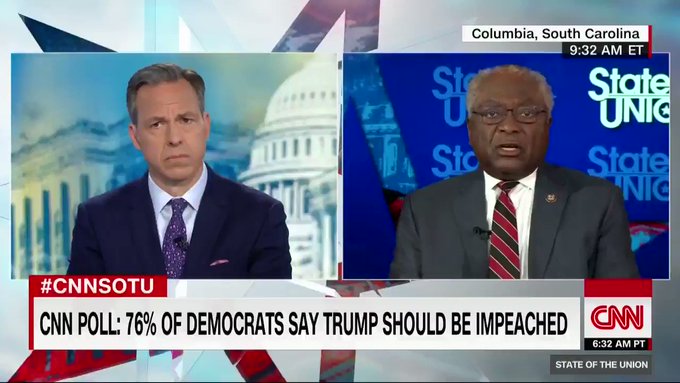 To: Wharf Rat who wrote (1138644 ) 6/2/2019 2:05:59 PM From: Winfastorlose Read Replies (1) | Respond to of 1576865 No. 3 Dem Admits Impeachment Is About Politics, Not 'What's Right' by Tyler Durden Sun, 06/02/2019 - 13:45 Despite Democrats' like Alexandria Ocasio-Cortez's and Elizabeth Warren's insistence that Democrats' are duty-bound to initiate impeachment proceedings against President Trump, party leaders like Nancy Pelosi and Steny Hoyer have made it clear that, ultimately, whether they decide to impeach Trump or not will be a political calculation. Notably, Pelosi's shift toward signaling an openness to impeachment coincided with polling data indicating that public support for such a move had increased. On Sunday, Majority Whip James Clyburn became the latest member of the Democratic Party's leadership to confirm that the party is simply waiting for polling data to indicate that a majority of the public supports impeachment - something that, in all likelihood, won't happen - before moving ahead with their plans. During an interview with Jake Tapper on CNN's "State of the Union," Clyburn, the third-ranking Democrat in the House, said he believed that the Democrats would vote to impeach Trump "at some point," but that Democrats must first succeed in building a case for impeachment and selling it to the public. "What Nancy Pelosi is trying to do, and the rest of us in the House of Representatives, is developing a process to efficiently move on this issue so when we get to the vote, something she calls iron clad I call effective, that is why we are trying to take our time and do this right," Clyburn said. He added that House Democrats are not "particularly interested in the Senate," but rather are waiting to "bring the public along. "We do believe if we efficiently and effectively educate the public then we would have done our job and we can move on an impeachment vote," Clyburn said. Clyburn said that Mueller "has developed the grounds for impeachment," but "the House has to determine the timing for impeachment, there's a big difference." State of the Union ?@CNNSotu . @JakeTapper : “It sounds like you think that the President will be impeached, or at least proceedings will begin in the House at some point, but just not right now?" @WhipClyburn : "Yes, that's exactly what I feel." t.co #CNNSOTU 672 7:45 AM - Jun 2, 2019 345 people are talking about this Twitter Ads info and privacy In other words: Impeachment was never about what's right, or what's legal - it's about what's politically feasible. Don't forget that.zerohedge.com