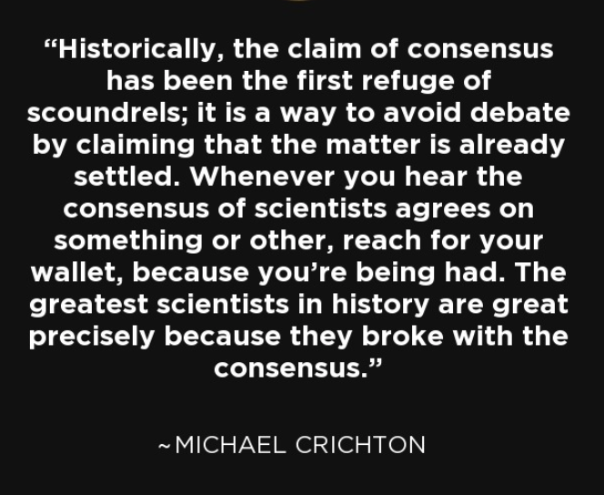 If everyone understood these wise words from Michael Crichton, there would be no climate crisis cult. Herd mentality (collective consensus) should be confined to politics (decisions), so long as politics is informed by truth based on science and reason.