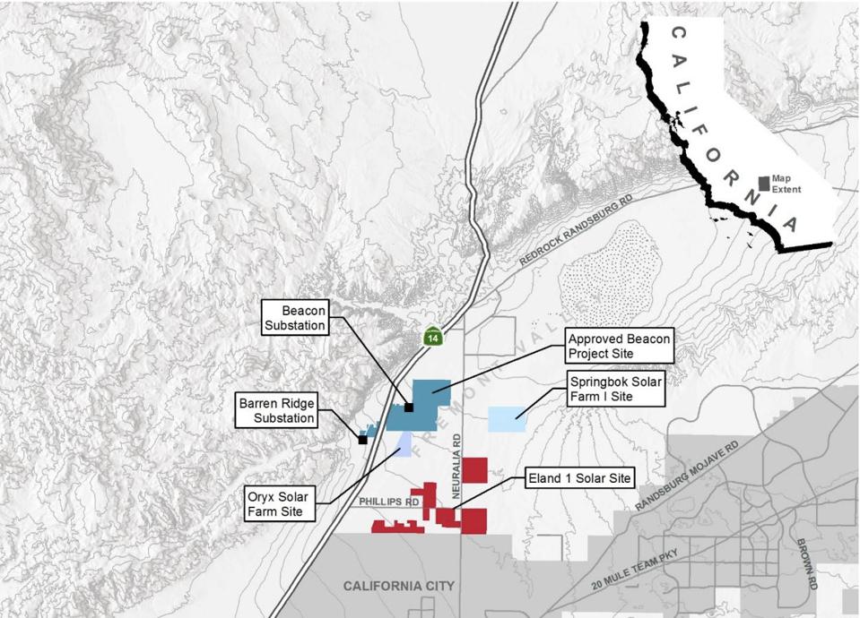 The Eland Solar Site is marked in red in this map of the Barren Ridge renewables corridor in Kern County.