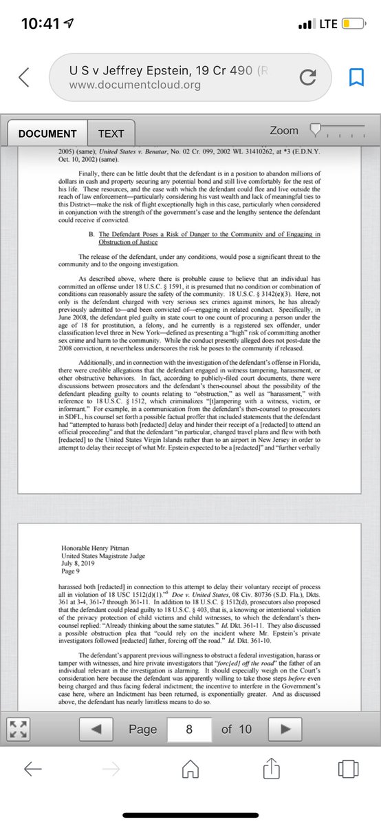 Noteworthy from the SDNY bail memo on Epstein: Florida prosecutors not only knew Epstein was a sexual predator but also that he harassed & intimidated the victims & their families to stop them from testifying. No federal prosecutor should let conduct like that go. Acosta did.
