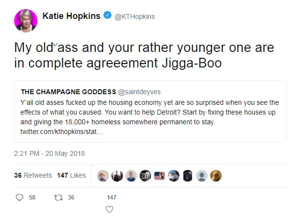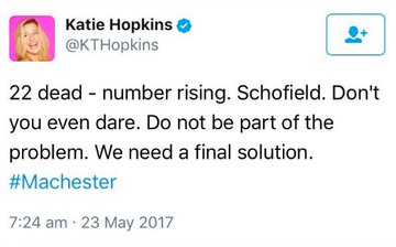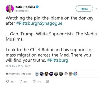 Read Replies (1) | Respond to of 1577900 TRUMP DEFENDS 'SEND HER BACK' CHANTERS WITH RETWEET OF KATIE HOPKINS, FAR-RIGHT COMMENTATOR WHO CALLED MIGRANTS 'COCKROACHES' BY GILLIAN EDEVANE ON 7/20/19 AT 10:05 AM EDT President Donald Trump continued to defend himself and his supporters after racist chants broke out at his North Carolina campaign rally earlier this week, releasing a torrent of tweets and retweets Saturday morning that attempted to justify his inaction when those in attendance began to yell "send her back" in reference to Somali-born Congresswoman Ilhan Omar. In his latest attempt to defend himself, however, Trump once again elevated the voice of Katie Hopkins, a far-right British commentator who has likened immigrants to rodents and cockroaches, encouraged law enforcement to racially profile the public and once tweeted a racist slur at a black man . "As you can see, I did nothing to lead people on, nor was I particularly happy with their chant — just a very big and patriotic crowd. They love the USA!," Trump wrote, adding his commentary to a post from Hopkins with his 62 million twitter followers. The original tweet from Hopkins asserted that "Send her back is the new lock her up," a reference to the rallying cry Trump and his supporters used in 2016 to disparage opponent Hillary Clinton. Lest anyone think she was criticizing these chants, Hopkins concluded with the note "Well done to #TeamTrump." Donald J. Trump ?@realDonaldTrump As you can see, I did nothing to lead people on, nor was I particularly happy with their chant. Just a very big and patriotic crowd. They love the USA! t.co Katie Hopkins ?@KTHopkins New Campaign slogan for #2020? “Don’t love it? Leave it!” Send her back is the new lock her up. Well done to #TeamTrump 5:57 AM - Jul 20, 2019 A video attached to Hopkins' tweet shows the incendiary moment from Wednesday's rally, during which Trump accuses Omar of "launching vicious, anti-semitic screeds." The crowd then launches into the "send her back" chant, while Trump stands silently at the podium, allowing the chorus to grow. The stunning moment irked some Republican lawmakers and, according to reports, those within Trump's inner circle. In the days since, the president has waffled between supporting those in attendance and distancing himself from their cries. President Donald Trump takes the podium before speaking during a Keep America Great rally on July 17, 2019 in Greenville, North Carolina. Trump is speaking in North Carolina only hours after The House of Representatives voted down an effort from a Texas Democrat to impeach the President.ZACH GIBSON/GETTY IMAGES In other Saturday morning tweets, Trump retweeted a 2-minute video spiel from Hopkins in which she argued, nonsensically, that a vote against Trump was a vote in favor of ISIS. The president also shared a tweet of Hopkins' that criticized London law enforcement and London Mayor Sadiq Khan, and yet another post in which Hopkins said, "How I wish we had such leadership in the U.K," referring to Trump. It's not the first time the president has seemingly legitimized the perspective of the commentator. Earlier this month, he pushed forward her praise of far-right leaders, sparking another backlash. As critics noted, the president dramatically expands Hopkins' reach on the social media site with each share. For the most part, her missives garner between a couple hundred and a couple of thousand likes; those retweeted by the president have earned tens of thousands. She currently has just under 1 million followers on the social media platform. On Saturday, the term "Katie Hopkins" began to trend on Twitter, with scores of prominent users decrying the president's tacit endorsement. Will Jordan ?@williamjordann Here’s a sampling of Katie Hopkins, a notorious figure in the UK who the president is retweeting again. 570 8:15 AM - Jul 20, 2019 Shannon Watts ?@shannonrwatts Donald Trump is retweeting Katie Hopkins, a woman who uses the slur "Jigga-boo,” and also Tweeted, “Dear black people. If your lives matter why do you stab and shoot each other so much?” t.co Donald J. Trump ?@realDonaldTrump As you can see, I did nothing to lead people on, nor was I particularly happy with their chant. Just a very big and patriotic crowd. They love the USA! https://twitter.com/kthopkins/status/1151738558501330945 … 3,338 8:03 AM - Jul 20, 2019 s George Conway, an attorney and notorious Trump critic who is married to White House Counselor Kellyanne Conway, was among the many social media users on Saturday to decry the elevation of Hopkins' writings.newsweek.com