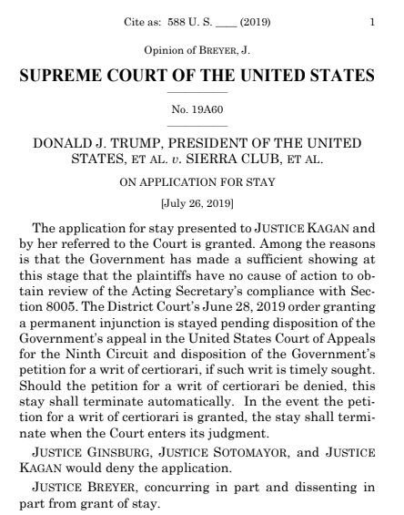 NOW: In a divided decision, the Supreme Court rules the Trump administration can begin using some of the contested federal funds Trump redirected for border wall construction — the court granted the admin's request to stay a lower court injunction t.co