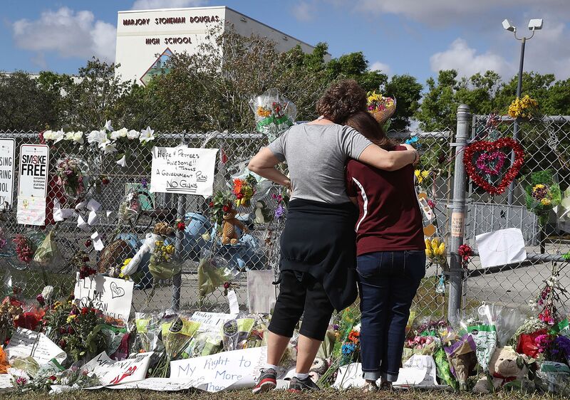 People stand at a memorial in front of Marjory Stoneman Douglas High School after the mass shooting there in Parkland, Florida.