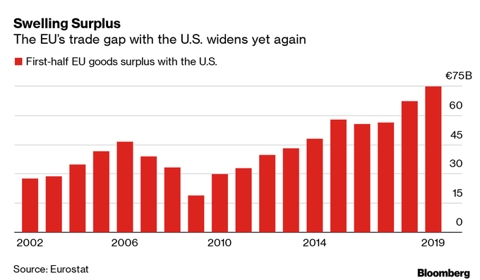 Graph from Bloomberg... The United States has a bigger trade deficit with Europe now than it did when President Trump took office.