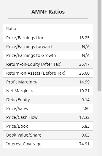 To: richardred who wrote (5458 ) 8/22/2019 2:21:44 PM From: E_K_S Read Replies (1) | Respond to of 7239 No interest in STKL. Still burning cash not very cheap when selling 1.4x BV revenues ok but cost of sales high so margins not that good (like w/ spice company). Much better margind w/ AMNF or even JJSF. My penny stock AMNF now selling at $3.64/share has been a keeper (owned for 9 years w/ avg cost @ $0.67/share). Continues to pay a 2.75% div, getting close to $50mln in sales (aways to go to catch up w/ JJSF), Not too expensive at 18 PE (so I hold shares) and could it'self be a take over candidate. I like the products for JJSF: their principal products include SUPERPRETZEL, BAVARIAN BAKERY and other soft pretzels, ICEE and SLUSH PUPPIE frozen beverages, LUIGI'S, MINUTE MAID frozen juice bars and ices, WHOLE FRUIT sorbet and frozen fruit bars, MARY B'S biscuits and dumplings, DADDY RAY'S fig and fruit bars, TIO PEPE'S, CALIFORNIA CHURROS and OREO Churros, PATIO Burritos and other handheld sandwiches, THE FUNNEL CAKE FACTORY funnel cakes, and several bakery brands within COUNTRY HOME BAKERS and HILL & VALLEY. AMNF has only one product: Pesto . .They have been adding different flavors and I see it at COSTCO. Armanino Foods of Distinction, Inc. is an international food company that manufactures and markets frozen Italian, and other specialty food items such as pestos, sauces and filled pastas to the foodservice, retail, and industrial markets. In addition to a classic Basil Pesto, Armanino offers other flavors such as Cilantro, Dried Tomato & Garlic, Roasted Red Bell Pepper, Southwest Chipotle, Artichoke, Roasted Garlic, and Light Basil Pesto. It also offers sauces including Chimichurri, Harissa, Creamy Garlic, Italian Salsa Verde, Romesco, Bolognese sauce, and Alfredo sauce. Armanino’s Organic line includes classic Basil Pesto. Cheese shakers, as well as frozen pastas and meatballs are also offered by Armanino Foods. EKS
