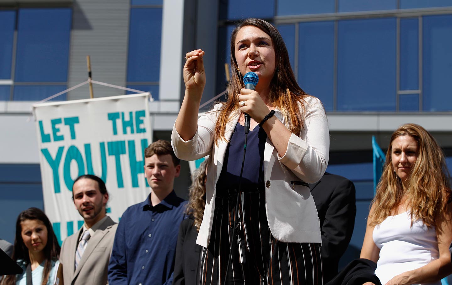 Kelsey Juliana speaks at a rally in Portland, Oregon, on June 4, for a group of young people who filed an environmental lawsuit against the US government. (AP Photo / Steve Dipaola, File)